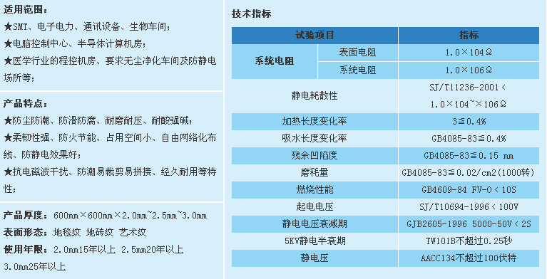 使用場所:PVC防靜電地板是以PVC樹脂為主體,經(jīng)特殊加工工藝制作而成,PVC粒子界面間形成導靜電網(wǎng)絡(luò),具有永久性防靜電功能。外觀美麗漂亮,具有較好的裝飾效果。適用于電信、電子行業(yè)程控機房、計算機房、潔凈廠房等要求凈化及防靜電場地。